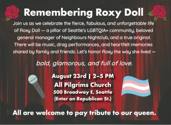 The SGN will host, in coordination with the family, a memorial service for the community in Roxy’s honor on August 23 at 2-5pm. The event will be held in the same building as the SGN office, All Pilgrims Church at 500 Broadway E. on Capitol Hill, Seattle.