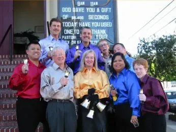 Bell Appeal’s members throughout the years have been a mix of Bethany congregants, musicians from the marching band, and local residents. The group has also performed with the San Francisco Gay Men’s Chorus, such as in 2004 at the choral group’s beloved Christmas Eve holiday shows.