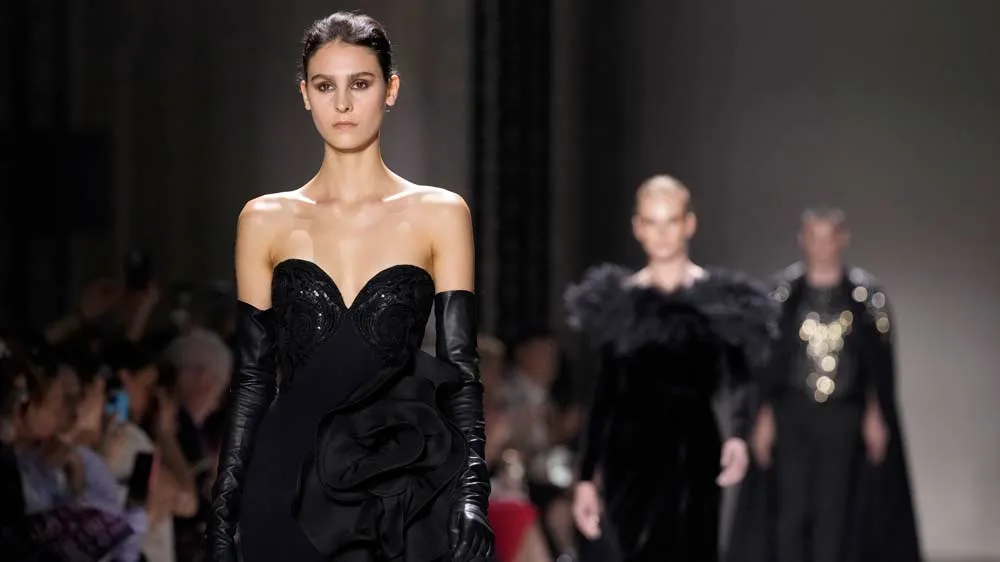 The Lebanese designer's fall collection came with dramatic flair, strikingly at midnight, enveloping the audience in a welcome dark mood. Models in black leather opera gloves and graphic bands of black satin set the tone.